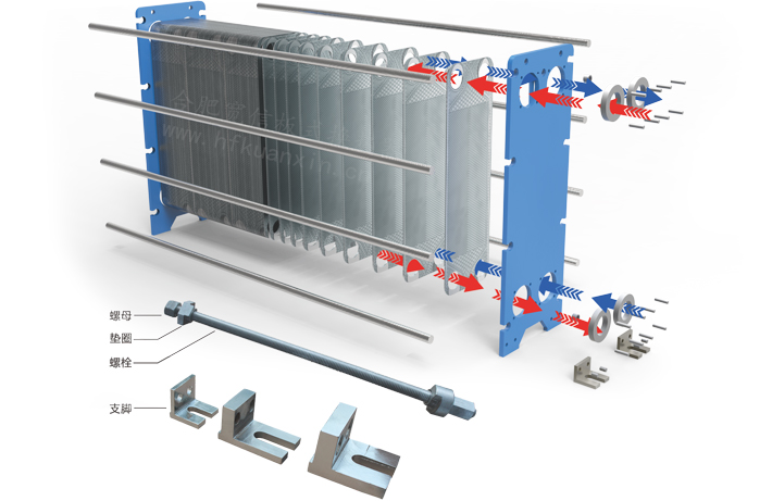 板式換熱器是由一組波紋金屬板組成,板片上有四個角孔,以供熱交換的兩種液體通過。金屬板片安裝在一個側(cè)面有固定板和活動壓緊板的框架內(nèi),并用夾緊螺栓夾緊。板片上裝有密封墊片,將流體通道密封,并且引導(dǎo)流體交替地流至各自通道內(nèi)波紋板不僅提高了湍流程度,并且形成許多支撐點(diǎn),足以承受介質(zhì)間的壓力差。金屬板和活動壓緊板懸掛在上導(dǎo)桿,并由下導(dǎo)桿定位,而桿端則固定在支撐柱上。