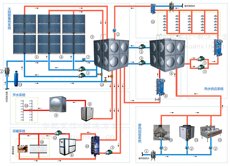 太陽(yáng)能、空氣能采暖和余熱回收可單獨(dú)或組成制備熱水,經(jīng)過(guò)換熱器為用戶客房洗浴、冬季空調(diào)采暖、夏季空調(diào)制冷使用,同時(shí)換熱器可將太陽(yáng)能、空氣能采暖和余熱回收中經(jīng)過(guò)處理的水與自來(lái)水環(huán)路分離開(kāi),積垢問(wèn)題腐蝕問(wèn)題可以輕松解決,太陽(yáng)能、空氣能采暖和余熱回收供熱水是世界上應(yīng)用最廣泛的清潔可再生的一種能源。目前廣泛運(yùn)用于住宅、賓館、學(xué)校、機(jī)關(guān)等場(chǎng)所。為滿足熱量不足時(shí)的用熱需求,通常采用燃?xì)忮仩t或電加熱器作為熱水系統(tǒng)的輔助熱源。