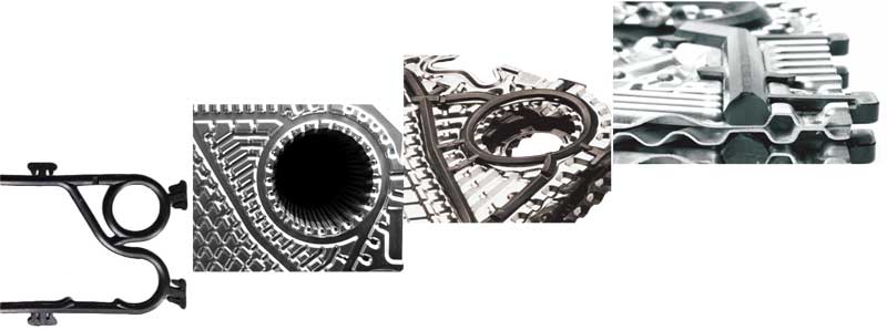板式換熱器是由一組波紋金屬板片組成,板片上有四個(gè)孔角,以供熱交換的兩種液體通過,金屬板片安裝在一個(gè)側(cè)面有固定板和活動(dòng)壓緊板的框架內(nèi),并用夾緊螺栓夾緊。板片上裝有密封膠墊,將流體通道密封,并且引導(dǎo)流體交替地流至各自的通道內(nèi)。寬信板片: