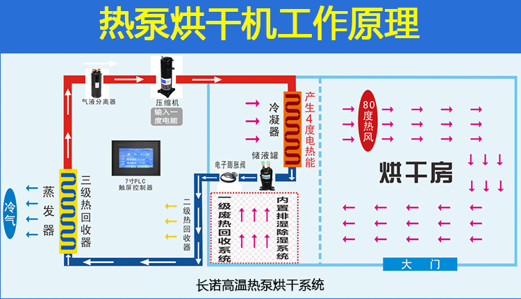 熱泵干燥機(jī)由壓縮機(jī)——換熱器(內(nèi)機(jī))——節(jié)流器——吸熱器(外機(jī))——壓縮機(jī)等裝置構(gòu)成了一個(gè)循環(huán)系統(tǒng)(主機(jī)+烘干房)。冷媒在壓縮機(jī)的作用下在系統(tǒng)內(nèi)循環(huán)流動(dòng)。它在壓縮機(jī)內(nèi)完成氣態(tài)的升壓升溫過(guò)程(溫度高達(dá)115℃),它進(jìn)入內(nèi)機(jī)釋放出高溫?zé)崃考訜岷娓煞績(jī)?nèi)空氣,同時(shí)自己被冷卻并轉(zhuǎn)化為流液態(tài),當(dāng)它運(yùn)行到外機(jī)后,液態(tài)迅速吸熱蒸發(fā)再次轉(zhuǎn)化為氣態(tài),同時(shí)溫度下降至零下20℃——30℃,這時(shí)吸熱器周邊的空氣就會(huì)源源不斷地將熱量傳遞給冷媒。冷媒不斷地循環(huán)就實(shí)現(xiàn)將空氣中的熱量搬運(yùn)到烘干房?jī)?nèi)加熱房?jī)?nèi)空氣溫度。