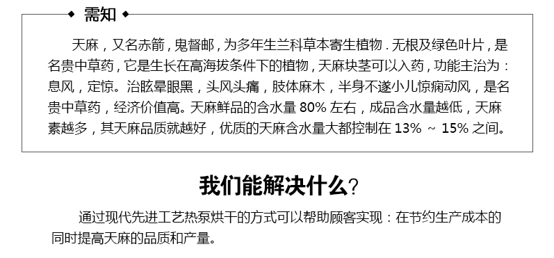 天麻,又名赤箭,鬼督郵,為多年生蘭科草本寄生植物.無根及綠色葉片,是名貴中草藥,它是生長(zhǎng)在高海拔條件下的植物,天麻塊莖可以入藥,主治風(fēng)濕,眩暈頭痛等,它的經(jīng)濟(jì)價(jià)值高,以前依賴于野生,現(xiàn)在已人工栽培。更詳細(xì)的烘干方案請(qǐng)到如下網(wǎng)址索?。?/strong>