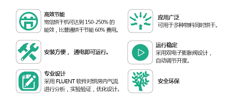 寬信熱泵烘干針對(duì)客戶特定品種,特定產(chǎn)量,特定要求給出一對(duì)一烘干方案,制定出唯一方案來滿足客戶的要求,為客戶烘出一級(jí)品質(zhì)的物料,真正為客戶制定一套省心省錢的烘干方案,量身定制 + 長(zhǎng)期跟蹤服務(wù) + 上門安裝調(diào)試+ 技術(shù)指導(dǎo) + 一級(jí)品品種。