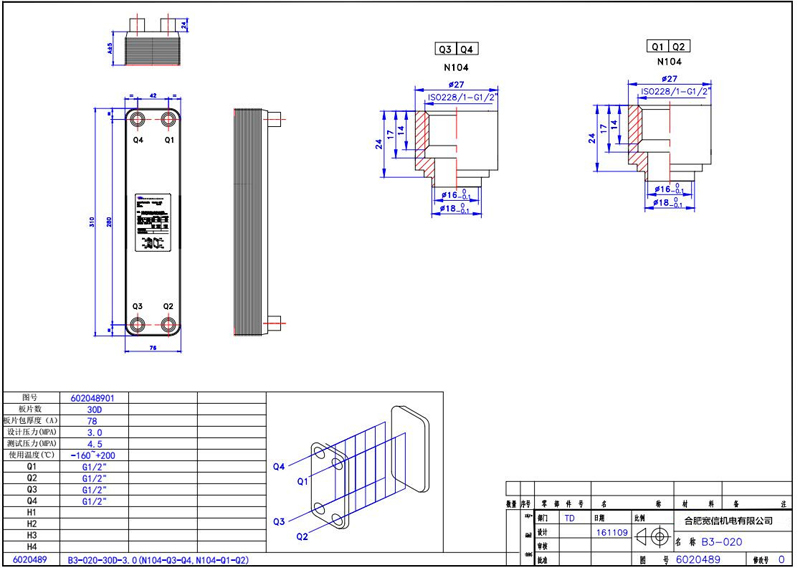 釬焊板式換熱器的工作溫度范圍在:-160℃~+225℃,最低工作壓力(制冷劑)3.2MPa最大工作壓力(水)2.5MPa單通道容積0.4L水側最大流量105m3/h回路組合形式雙回路、單回路。