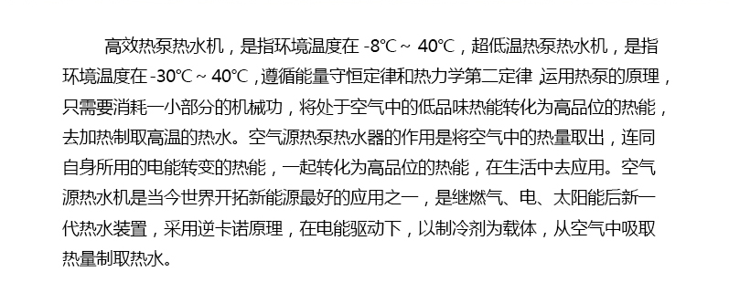 寬信熱泵熱水機(jī)分為常溫?zé)岜脽崴畽C(jī)和超低溫?zé)岜脽崴畽C(jī)。是指在一定的溫度下,遵循能量守恒定律和熱力學(xué)第二定律,運(yùn)用熱泵的原理,只需要消耗一小部分的機(jī)械功,將處于空氣中的低品味熱能轉(zhuǎn)化為高品位的熱能,去加熱制取高溫的熱水??諝庠礋岜脽崴鞯淖饔檬菍⒖諝庵械臒崃咳〕?,連同自身所用的電能轉(zhuǎn)變的熱能,一起轉(zhuǎn)化為高品位的熱能,在生活中去應(yīng)用??諝庠礋崴畽C(jī)是當(dāng)今世界開拓新能源最好的應(yīng)用之一,是繼燃?xì)?、電、太陽能后新一代熱水裝置,采用逆卡諾原理,在電能驅(qū)動下,以制冷劑為載體,從空氣中吸取熱量制取熱水。http://www.zghonggan.com/project_rbrs.html