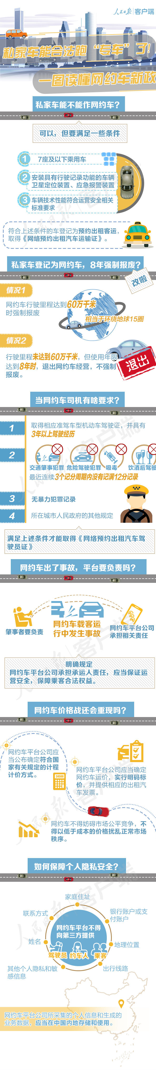 28日下午3時,隨著《關(guān)于深化改革推進(jìn)出租汽車行業(yè)健康發(fā)展的指導(dǎo)意見》、《網(wǎng)絡(luò)預(yù)約出租汽車經(jīng)營服務(wù)管理暫行辦法》對外公布,醞釀兩年之久的出租汽車改革及網(wǎng)約車新政方案終于揭開面紗。方案中最令人關(guān)注的是,網(wǎng)約車的合法地位獲得明確。今后,滿足條件的私家車可按一定程序轉(zhuǎn)化為網(wǎng)約車,從事專車運(yùn)營。