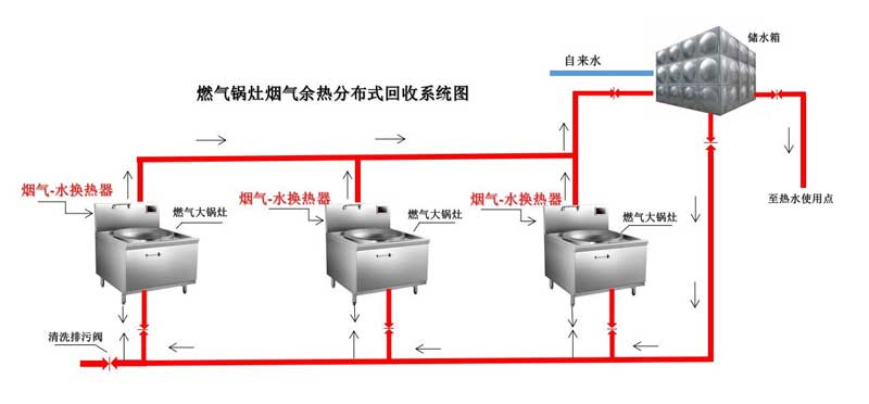 寬信自主研發(fā)生產(chǎn)的廚房煙氣余熱回收換熱器直接安裝與順昌生產(chǎn)的燃?xì)忮仩t大鍋灶的后煙道上,利用鍋爐排煙溫度500-600°C左右攜帶的熱能,制產(chǎn)熱水送至儲水箱備用,水箱備用的熱水可供廚房自用,也可供給其它場合使用。廚房煙氣余熱回收換熱器有效的降低了排煙溫度和減少火災(zāi)隱患,隨爐灶灶火一同自動啟動運行,不需要人工操作,爐灶熱效率提高30%以上。